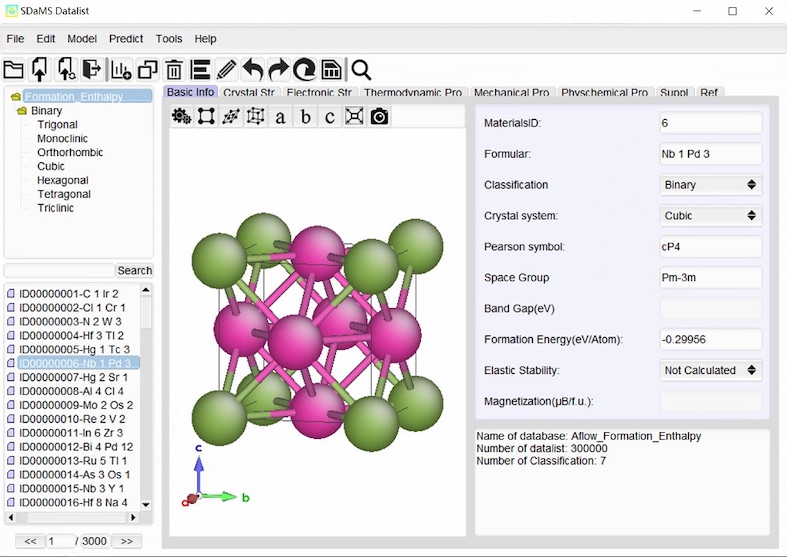 SDaMS 提供多种描述符生成方法和机器学习方法,实现与数据库的无缝集成,便于高效构建模型。平台内置多种专业数据库,包括超硬材料、生物相容性材料、低维材料等特定数据库,以及源自ICSD、PCD、ASM的原型数据库。此外,SDaMS集成了本课题组开发的模型库,为预测材料结构和性能提供便捷高效的途径,推动前沿材料研究与开发。