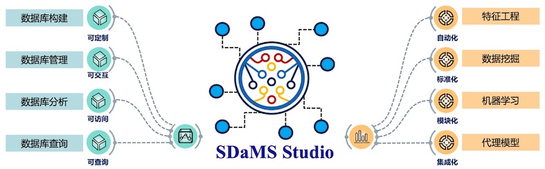 SDaMS 是由北京航空航天大学 MICID 研究团队自2022年起开发的集成软件平台,致力于整合材料数据库与分析、数据挖掘与机器学习、建模与知识发现。该平台提供简洁的数据库图形用户界面,支持基于SQLite和MySQL的本地/远程数据库快速构建与编辑,以及通过多种机器学习算法构建稳健的物理和数学模型。该平台为用户提供从数据库构建、数据分析与挖掘、机器学习模型创建到可视化编辑的完整工作流平台。此外,研究团队已收集并构建了一系列数据库和模型库,以扩展SDaMS的应用能力。
