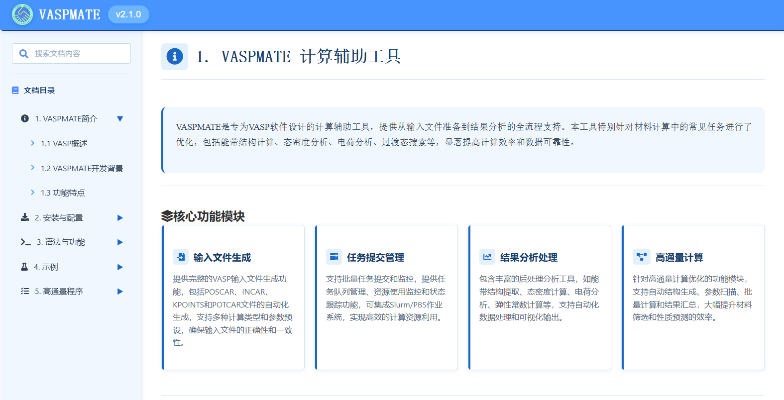 - 版本 2.0: 提供详细的指南手册阐明语法格式和规则。新增POSCAR、INCAR、KPOINTS和POTCAR文件操作命令。增强高通量任务自动设置,增加自动一致性和收敛性检查,支持sdata/JSON/SQLite3数据库自动构建。新增两种弹性常数计算方法,支持AIMD模拟及随机和演化结构生成等。