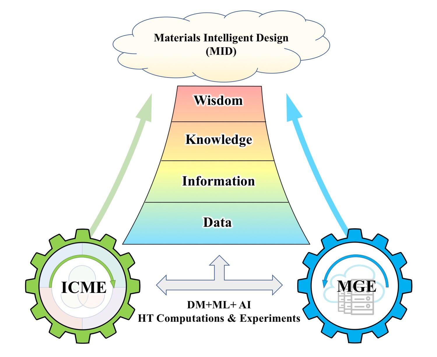 集成计算材料工程(ICME)和材料基因组工程(MGE)的发展引领了材料设计范式从经验型、理论型向理性计算型的转变,这进一步为数据驱动设计范式奠定了基础。通过整合实验与计算中的高通量技术、基于普适原理的大数据科学、依托数据挖掘和机器学习的信息学与知识发现,最终实现了通过人工智能实现材料智能设计(MID)的可能性。我们强调通过模块化、自动化、标准化、集成化和智能化获取多级结构材料的性能-结构-工艺-应用关系链,遵循数据-信息-知识-智慧的层级关系,这与过去的经验型、理论型和计算型范式有根本性差异。MID新时代将通过以新概念为指导的集成基础设施,从根本上革新材料创新模式,这种模式在思维方式和工作方法上完全不同于过去的经验、理论和计算范式,为未来材料设计提供前瞻性的科学视野和方向。